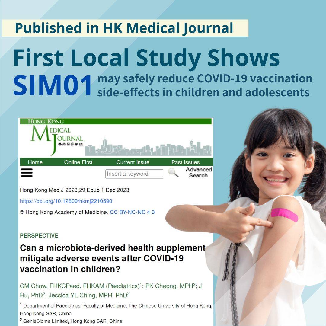 We are thrilled to announce our new publication in the Hong Kong Medical Journal, which reveals the FIRST local study on how SIM01, a novel microbiome formula, may safely reduce COVID-19 vaccination side-effects in children and adolescents.